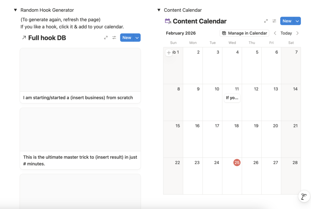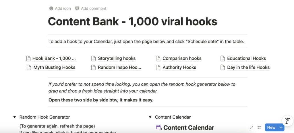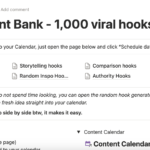 With this Notion Page I’ve created, you get 1,000 viral hooks with links to the videos that went viral with them. 1,000 HOOKS! WOW THAT IS A LOT!Don’t worry, everything is categorised to make it easier and I’ve also created a random hook generator so you can drag and drop your hooks over straight into the content Calendar! You can plan a month worth of potentially viral content in a few minutes with this method. Easy!